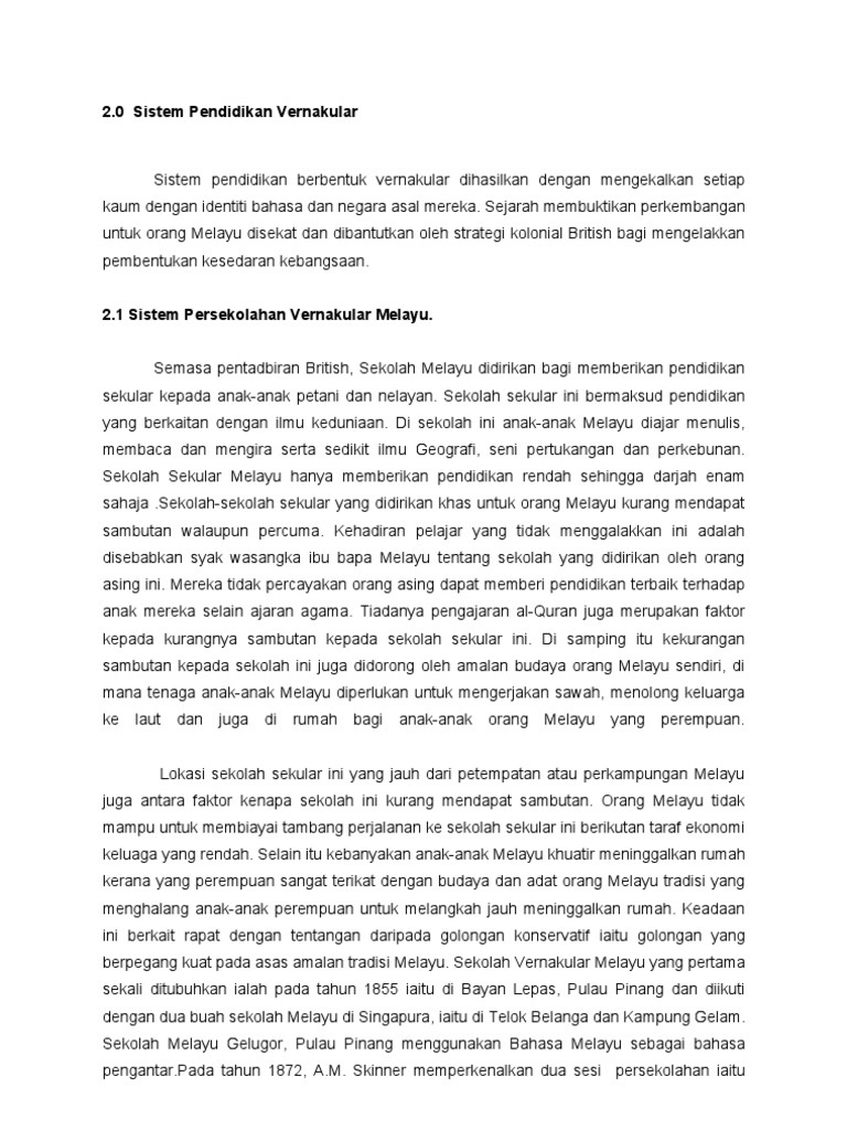 20 tahun 2003 tentang sistem. 2.1 sistem persekolahan vernakular melayu. Bayangkan jika semua berasaskan bangsa. Sistem pendidikan berbentuk vernakular dihasilkan dengan mengekalkan setiap kaum dengan identiti bahasa dan negara asal mereka. Huraikan sistem perkembangan pendidikan vernakular di tanah melayu sebelum merdeka.
