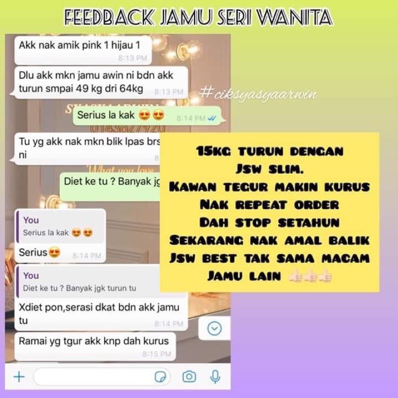 Klik gambar untuk besarkan item : Badannya mulus walaupun kulitnya tidak putih, tetapi bentuk tubuhnya sangat sempurna sebagai seorang wanita. Hentikan penggunaan dan dapatkan nasihat doktor jika terdapat kesan alahan. Ramuan tradisi ini kini dikomersilkan untuk memudahkan wanita. Fb fanpage seri dewi malam ummi syifa. Jamu seri pengantin (rahsia keanggunan wanita) kelebihan : Jamu seri dewi malam sdm pakar merawat masalah dalaman wanita dan lelaki,,rangkaian produk sdm diasaskan oleh ambar kasturi beauty house dan moden tradisional (mt). Jamu dewi suci harg a : Jangan ambil bersama jamu seri dewi malam sdm. Jamu seri bonda merupakan supplement terbaik untuk wanita masa kini. Khasiat jamu sebagai obat herbal didasarkan pada pengalaman empirik yang telah berlangsung sejak lama. Wanita bersalin ~ jamu jalinan cinta (semasa berpantang) (rm 48.00) ~ jamu pengantin dara (rm 65.00). Bahan2 parut,jeragat,kulit kasar bisul,gatal2,sakit kulit cegah dan merawat kanser atasi keletihan,naikkan seri.