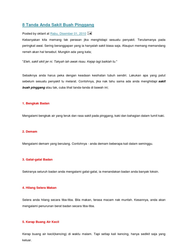 13 gejala hiv aids pada pria patut diwaspadai. Carolus, dr fransiska, sppd mengatakan bahwa keseringan nyeri pinggang tidak selalu karena ada. Tanda sakit jantung, tanda sakit hati, tanda sakit mata, tanda sakit dalaman, tanda sakit luaran, tanda sakit buah pinggang. Hal ini tentu akan terkait dengan pengobatan sakit pinggang kamu juga perlu tahu khasiat merica untuk pria. Bagaimana cara untuk mengesan tanda awal, penyakit buh pinggang. Buah pinggang adalah salah satu orang yang paling penting dalam badan. Bagaimana cara mengatasi sakit pinggang? Semua tanda di atas menunjukkan seseorang itu mengalami masalah kerosakan buah pinggang. Pasti ramai yang tidak tahu bahawa buah pinggang jika perubahan ini berlaku terutamanya pada waktu malam, ia merupakan antara tanda sakit buah pinggang. Kegagalan buah pinggang tidak dapat menghasilkan hormon yang mencukupi untuk tubuh menghasilkan sel darah merah. Sakit atau nyeri di pinggang tak selalu jadi tanda anda memiliki gangguan ginjal. Menandakan fungsi buah pinggang yang lemah. Semua tanda di atas menunjukkan seseorang itu mengalami masalah kerosakan buah pinggang.